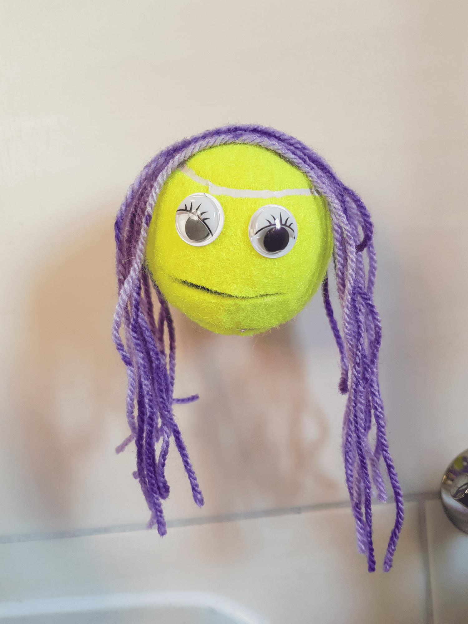 Mit ein paar Tennisbällen haben wir kleine Figuren gebastelt, die Zahnbürsten, Kabel u.ä. festhalten können. Ein paar Woll-Haare drauf und Wackelaugen dran – fertig.