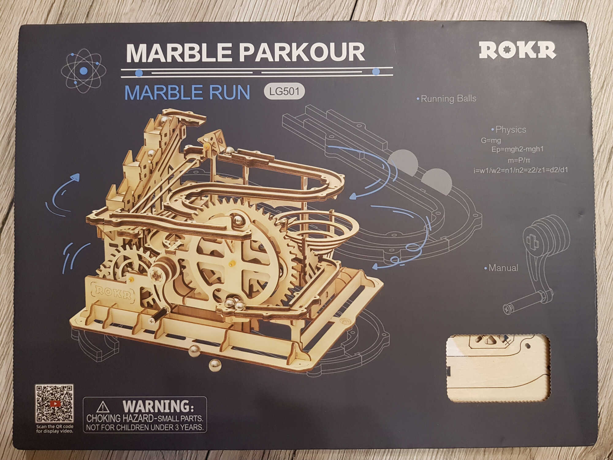 Außerdem eine Murmelbahn, von ROKR, auch aus der Familie von Robotime bzw. Rolife. Das wollte ich mit den Jungs zusammen bauen. Allerdings ist die Geduld der Prinzen sehr knapp bemessen und im Moment steht das Gerüst auf dem (übervollen) Schreibtisch.