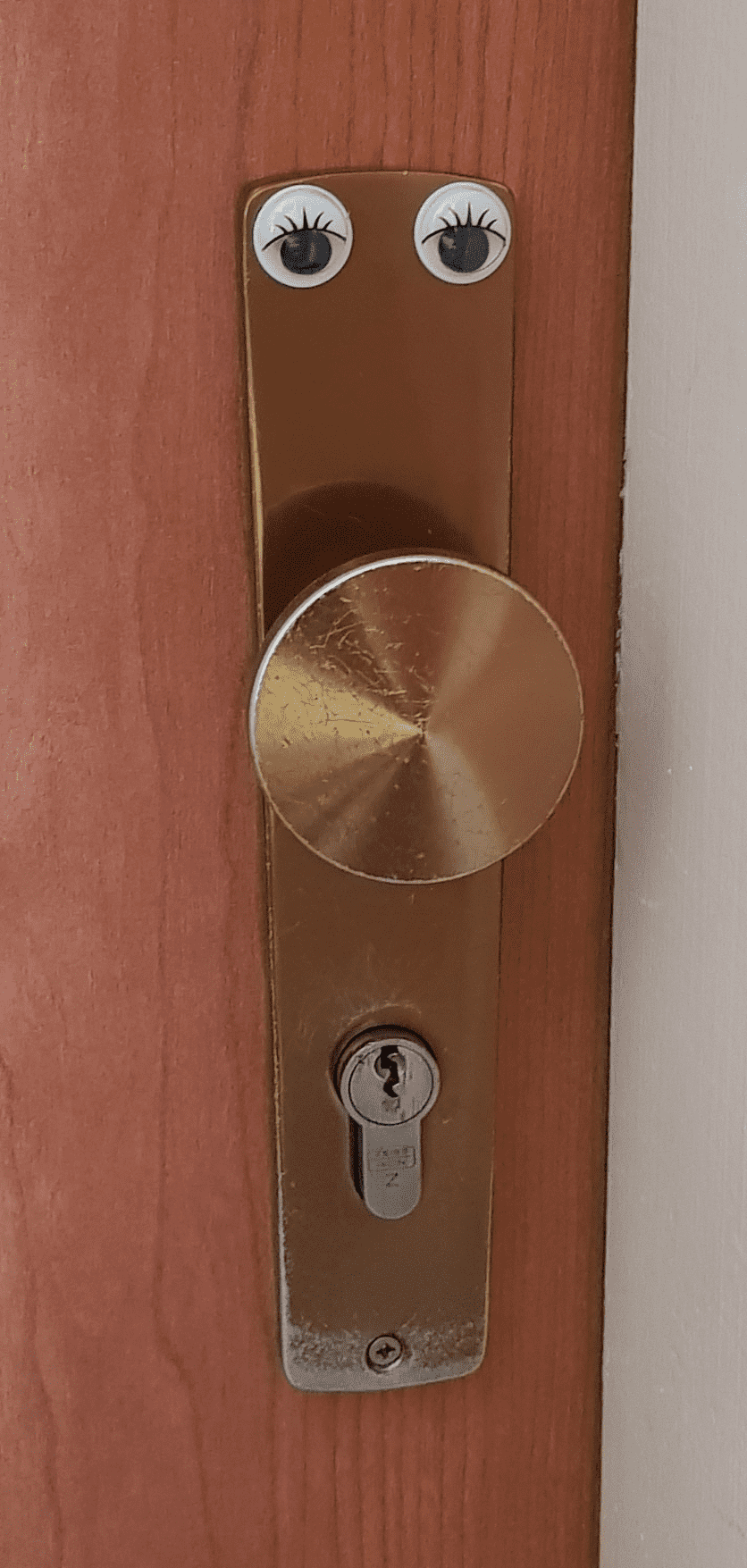 Da ich dann schonmal Wackelaugen in der Hand hatte, sind die auch gleich noch an die Wohnungstür gewandert. Also an die Schloss-Abdeckung. Wie heißt dieses Stück Metall? (Fragt Göga) Beschlag, sagt er. Klingt komisch, scheint aber richtig zu sein.